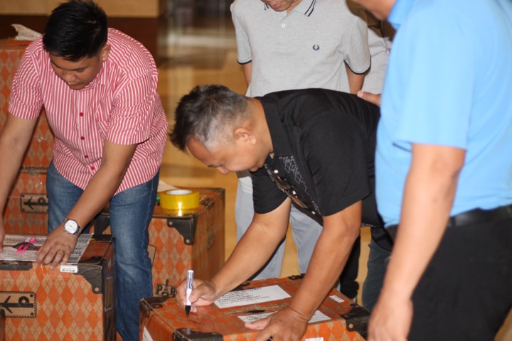 Several Filipino brethren help unbox the Bible study materials that we brought with us from the United States in eight large shipping boxes. They repackaged the literature, and prepared to ship it to various places in the Philippines.